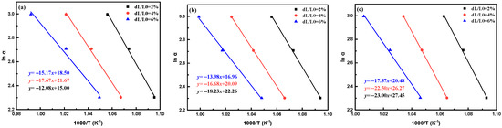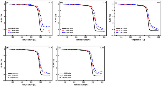 The activation energy corresponded to the energy barrier of glass to crystal transition, which was an important index to evaluate the crystallization ability of glass materials. Figure 5 shows the shrinkage curves for TC composite with various TC alloy addition recorded from room temperature to 900 °C using different sintering rates (α) of 10, 15, and 20 K/min. The specific linear shrinkages (dL/L0) of 2, 4, and 6%, and their corresponding temperatures were recorded to calculate the sintering activation energy of the TC composites with different sintering rates. Furthermore, the activation energy can be calculated by the Arrhenius equation as follows.