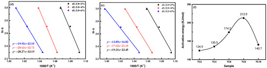Fitted results of ln α~1000/T plots and the sintering activation energy of the TC composites with various TC contents (a) TC2, (b) TC4, (c) TC6, (d) TC8, (e) TC16, and (f) the results of sintering activation energy of the TC composites..