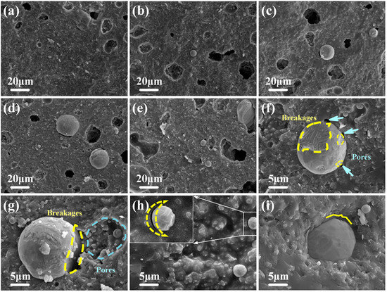 In addition, the gaps between TC and Al2O3 particles became wider by the TC particles with large area breakage, causing a lower surface tension for the liquefied vitrified bond, which also resulted in voids and connected pores around the TC particles (Figure 7f,g). Figure 7h shows the surface morphology of the TC16 composite. A crescent-shaped gap was formed between the TC powder and the matrix, which was caused by the different shrinkage of the TC ally and the matrix during cooling, and was another way for pore (void) formation. As shown in Figure 7i, there was a gully-like defect on the surface of the TC particle (showed by the yellow line), and the small area breakage had little effect on the liquid-state vitrified bond surface tension. Thus, the dense interface was still formed between the matrix and the TC particles. These show that the addition of TC alloy had significant effects on the morphology and the porosification of the TC composites.