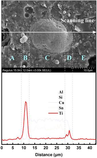 Figure 8 shows the microstructure and EDS result of the interface between the TC particle and the matrix. In the EDS results, the scanning area was divided into five parts and marked as A, B, C, D, and E, respectively. Areas A and D were the matrix area. Area B and D were the areas where the matrix covered the TC particle, and Area C was the area where the TC particle was exposed after the fracture. In Areas B and D, the element intensity of Al and Si decreased and that of Cu and Sn increased as the scanning point approached the TC particle, which was the classical element distribution rule for composite. Differently, the element intensity of Ti decreased with the scanning point approaching the TC particle, and its peak intensity was present in the matrix, which covered the TC particle in Areas B and D. In the meantime, the element distributions of Cu and Sn displayed an opposite trend to that of Ti. Comparing Ti distributions in Areas B and C, it could be found that the element intensity of Ti was much higher than that of Cu and Sn. It is suggested that the element segregation of Ti occurred during sintering. Ti was enriched in the matrix near the outer layer of the TC particle (Areas B and D).