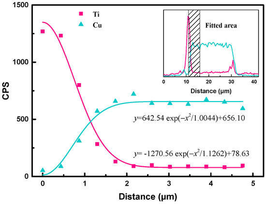 Figure 9 depicts the data points of Ti and Cu from line scanning EDS analysis and their fitted curves. The starting point for Ti diffusion was chosen at the peak position of signal intensity of Ti4+ in the matrix rather than at the alloy interface due to the presence of element segregation of Ti. At the same time, Cu2+ ion content at the starting point was the lowest value. Therefore, the Ti4+ ion relative content and its position in the matrix followed the fitted formula, as shown as follow.