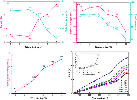 The CTE between 30 and 300 °C of the TC composite with various TC content is shown in Figure 11d. The TC composite reached the minimum value of the CTE (a = 3.74 × 10−6 °C−1) when the TC content was 2 wt%. Then, the CTE of the TC composites increased as the TC content increased, indicating that the addition of large amounts of TC alloy was not conducive to obtaining TC composites with low CTE. For glass-ceramic composites, its CTE was determined by the CTE of the crystals, ceramic filler, and residual glass phase produced during sintering. The CTE of the TC composite could be calculated as follows [7]: