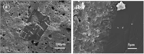 Figure 12 shows the cross-sectional microstructure of the TC4/CBN composite after flexural strength testing. Figure 12a illustrates that the matrix material was homogeneous in texture with spherical TC powder distributed in it. The presence of a cleavage plane on the CBN section indicated that the CBN particles were locally fragmented under load, providing new edges for the CBN composite abrasive and contributing to improving the self-sharpening of the abrasive tools. Figure 12b demonstrates the enlarged area of the dashed box in Figure 12a, which showed that the CBN grain was completely fused with the TC composite, with no defects such as cracks and small pores, which were conducive to improving the interfacial bonding strength of the TC/CBN composite.