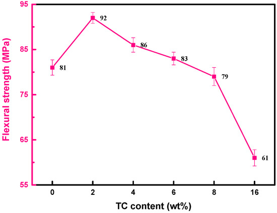 Figure 13 shows the flexural strength of TC/CBN composites with various TC contents. The flexural strength of TC/CBN composites first increased and then decreased with the increasing TC addition and reached the maximum value (92 MPa) when the TC amount was 2 wt.%. The value was about 14% higher than that of TC0.