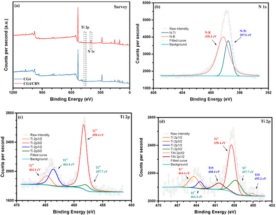XPS spectrum of the TC composite. (a) survey of TC4 and TC4/CBN composite, (b) N 1 s of TC4/CBN composite, (c) Ti 2p of the matrix added 4 wt% TC alloy, (d) Ti 2p of TC4/CBN composite.