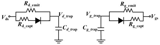 Few reported models have considered the effects of threading dislocations on both drain current and gate current in GaN HEMTs. Threading dislocations have effects on the fraction of filled traps, while trapping effects have a great influence on drain current. There are two common methods for modeling the effects of the traps on the drain current of GaN HEMTs. One is to capture the effects of traps caused by threading dislocations dynamically through RC networks [19,20,21,22], and the other is to model the trapping effects through the trap model based on the Shockley–Read–Hall (SRH) theory [23,24]. Compared with the trap model based on the RC network, the physical trap model based on the SRH theory requires a large amount of calculation and has a slow simulation speed. However, most trap models based on RC networks do not distinguish the charging and discharging paths of traps. For instance, ASM-HEMT model has empirically modified the model parameters such as the cut-off voltage () according to trap voltages generated by the RC network, capturing the drain current drop caused by traps [19]. However, its subcircuits are unable to generate two different time constants for capture and emission processes. Although the MVSG model employs RC or diode-capacitance networks to change either the ON resistance of the device () or the threshold voltage () dynamically, it cannot generate two different time constants for charge trapping and detrapping [20].
