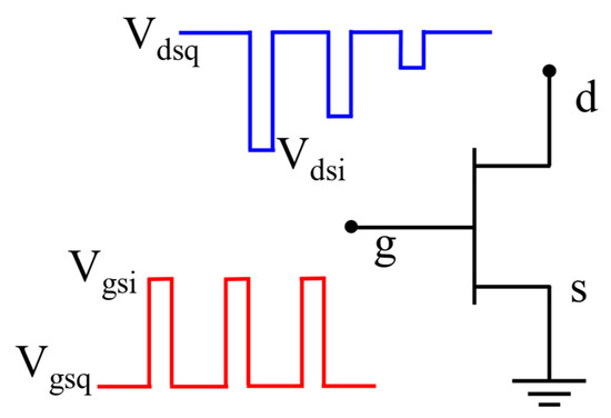 Pulsed measurement is a common method to study the charge capture and emission processes of GaN HEMTs [31]. In the pulsed measurements, signal generators are applied at the drain and gate terminals to provide inputs, as shown in Figure 2.