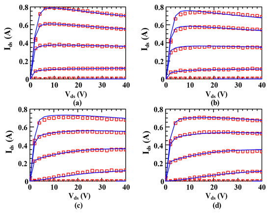 The pulsed measured data of the device under different gate quiescent bias voltages are shown in Figure 3a, and the pulsed measured data under different drain quiescent bias voltages are shown in Figure 3b. The pulse width is 1 μs and the pulse duty cycle is 0.1%. As can be seen from Figure 3, increases when decreases and increases. The drain current decreases initially but slowly recovers later when increases. The maximum drain current decreases with the decrease in and the increase in . By observing Figure 3, we also find that the values of model parameters, such as and , change with and , that is, different quiescent bias voltages may bring distinct extents of trapping effects. For a given temperature, the drain current is a function of , , , and .