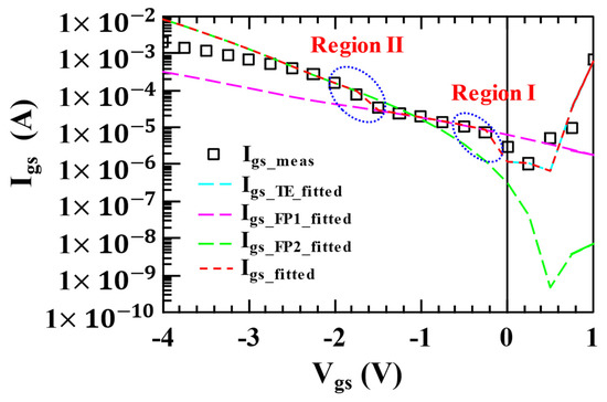 where is the area of the gate, is the thermionic emission (TE) current density, and is the PF emission current density. PF emission is considered to be the main leakage mechanism for gate current conduction in the low-to-medium reverse-bias region [25,26].