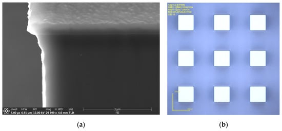 The average etching depth of the Bosch process is approximately 30 µm, and the average vertical etching rate is 0.75 µm/cycle. Figure 4a shows an SEM image of a silicon pillar sidewall etched with the SiNx mask. After the mask was removed, the value L2-Bosch was measured to calculate ∆LBosch and the relative deviation. Figure 4b shows an OM image of the sample using the SiNx mask after the Bosch process.