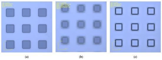 The mask pattern was a parallel square array, as shown in Figure 1. Both the side length and spacing of the square patterns were 20 µm. Measuring the side length of a square produces less error than for a circle, triangle, hexagon, and other geometric shapes. In addition, the periodic arrangement of the square patterns improves the uniformity of etching.