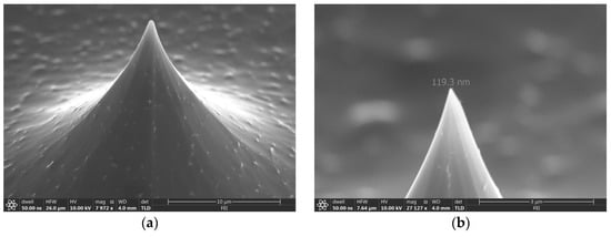 Figure 6 shows an SEM image of the silicon tip fabricated by the isotropic process in this work. The diameter of the tip structure is 119.3 nm. The process can be used for the fabrication of biomedical microneedles, AFM, and other structures because the feature size of silicon tips can be modulated by mask patterns and parameters.