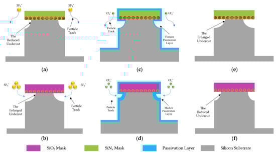 Schematic diagram of a charged mask acting on ions. (a) SF5+ ions are repelled by positive charges. This lowers lateral etching rates and reduces undercut. (b) SF5+ ions are attracted by negative charges. This raises lateral etching rates and an enlarges undercut. (c) CFx+ ions are repelled by positive charges. Then, a thinner passivation layer is formed at the top sidewall. (d) CFx+ ions are attracted by negative charges. Then, a thicker passivation layer is formed at the top sidewall. (e) The thinner passivation layer in (c) causes an enlarged undercut after the etching process. (f) The thicker passivation layer in (d) causes a reduced undercut after the etching process.