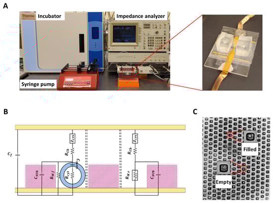 (A) Experimental setup and microchip. (B) Schematic of the circuit model that consists of all electrical components. (C) A view of the microchip showing the biological cells captured with gravitational force and empty wells.