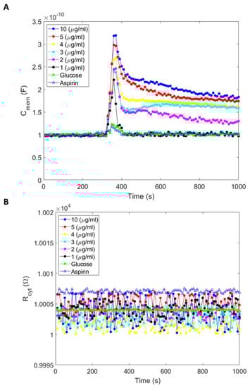 In our previous study [], we demonstrated that dendritic gold nanostructures provide the context to measure cell properties in a physiological buffer due to the significant reduction in the EP effect. Herein, we explored the potential use of the microfluidic device for real-time monitoring of cell membrane capacitance in response to different doses of amiodarone compared to aspirin/acetylsalicylic acid and glucose. The three compounds were selected for the study because they have distinct chemical, physical, and biological properties. Amiodarone is an antiarrhythmic medication used to treat and prevent certain types of life-threatening ventricular arrhythmias (abnormal heart rhythm). It is known to have a complex electrophysiological effect. Aspirin/acetylsalicylic acid is the most common non-steroidal anti-inflammatory drug. Glucose is the main six-carbon simple sugar in the blood and is utilized as a metabolic fuel in all cells.