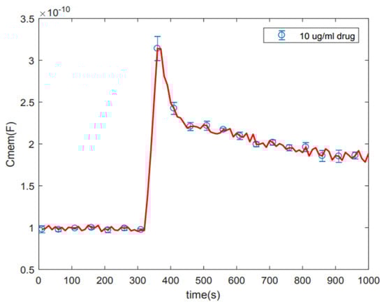 The measurements for amiodarone-induced membrane capacitance change were repeated three times, and standard deviations extracted from the data were analyzed. Figure 3 shows cell membrane capacitance variation as a function of time for 10 µg/mL amiodarone. Although the data were obtained every 10 s, standard deviations from the measurements are shown every 50 s in order not to clutter the plot. The results validate the precision of measurements and data extraction procedures, as well as the repeatability of the experiments.