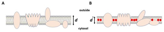 The plasma membrane of cells is a lipid bilayer containing various types of proteins embedded to form a 3-dimensional mosaic assembly []. The lipid bilayer comprises amphipathic phospholipids that face the cell’s interior and exterior with their water-soluble polar head groups []. At the same time, their water-insoluble hydrophobic fatty acid chains are tucked into the hydrophobic core portion. While the bilayer establishes the boundary of the cell, it is also structurally and functionally an integral part. It serves as an interface where the cell interior communicates with the external environment. Thus, cell survival depends not only on the ability of the plasma membrane to protect the cell interior and membrane-associated functions involved in sensing environmental changes, but also recognizing and transducing extracellular molecular signals, controlling the influx and efflux of ions and molecules, and mediating cellular responses [,].