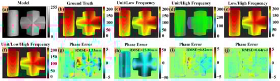 - Li, Y.; Qian, J.; Feng, S.; Chen, Q.; Zuo, C. Composite fringe projection deep learning profilometry for single-shot absolute 3d shape measurement. Opt. Express 2022, 30, 3424–3442. [Google Scholar] [CrossRef]