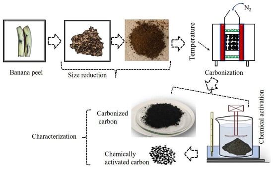 - Viena, V.; Elvitriana; Nizar, M. Characterization of Activated Carbon Prepared from Banana Peels: Effect of Chemical Activators on the Adsorption of Gas Emissions. J. Physics: Conf. Ser. 2019, 1232, 012005. [Google Scholar] [CrossRef]