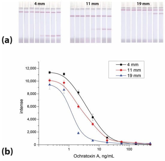 The location of the test zone on the working membrane can affect the analytical parameters of an LFIA [30]. In our previous study, we demonstrated that upon changing the position of the binding zone its coloration and the assay sensitivity also changed [10]. In this study, the same effect was observed for OTA: the OTA LOD in the LFIA depends on the position of the binding zone (Figure 1).