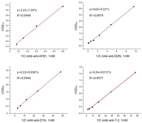 The second step was to calculate the association and dissociation kinetic constants of (ka and kd). For this, the dependencies of OD450 on the concentrations of antibodies upon the addition of the analyte at excess concentrations were obtained (Figure 3). The measurement of kinetic dissociation constants was based on the following principle. Immune complexes of immobilized hapten-BSA conjugate and added antibodies were formed in microplate wells and then, after removal of unbound antibodies, were dissociated. To prevent the re-association of the released antibodies with the hapten-BSA conjugate, an excess of free hapten was added to the wells. Reactant concentrations were chosen to provide this excess. Namely, the hapten-BSA conjugates were added to the wells for immobilization at a concentration of 1 μg/mL (~15 nM per BSA). The amount of protein per well was comparable to the nominal capacity limit of the used microplates, but the number of actually immobilized conjugates could have been less. Although the conjugate contains several hapten groups, steric hindrances limit the amount of antibodies that can bind to one molecule of the immobilized conjugate to a few antibodies. Taking into account these factors, we can state that the content of conjugated hapten in our system is near or higher than the level of 10-8 M. AFB1, DON, OTA, and T2 were added at a concentration of 0.5 µg/mL, which corresponded to molar concentrations in the range of 1.1–1.7 µM. Thus, the concentration of free hapten was approximately two orders of magnitude more than the concentration of conjugated hapten. Under these conditions, the binding of dissociated antibodies with free hapten was much more likely than the re-association with conjugated hapten. That is, the dissociation of the antibody-(hapten-BSA) complex in our experiment could be considered an irreversible process, and its rate was determined only by the value of the kinetic dissociation constant (see Supplementary Materials, Section S2).