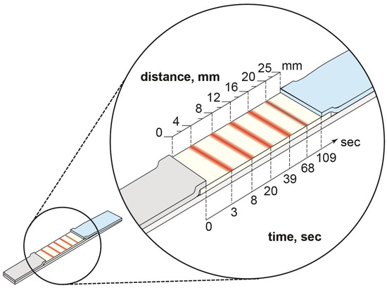 The decrease in the flow rate under increasing distance from the flow start was previously demonstrated for a LFIA [32,33]. Due to this, the location of the binding zones affects their coloration intensity and, therefore, the assay sensitivity. The maximum intensity is registered in the absence of the analyte in the sample. In this case, this value depends on the time required for the labeled antibodies to flow along the binding zone (Figure 4).