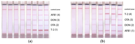 Multiplex test system with test zones arranged in order of ka in reverse (a) and the increasing order (b). Concentrations of mycotoxins for the 8 samples were 450 ng/mL, 150 ng/mL, 300 ng/mL, 150 ng/mL for DON, OTA, AFB1, and T-2, respectively; dilution 3 times per step. The test strips are arranged from left to right according to the AFB1 concentrations of 300, 100, 33.33, 11.11, 3.70, 1.24, 0.41, 0 ng/mL; DON concentrations of 450, 150, 50, 16.67, 5.56, 1.85, 0.62, 0 ng/mL; OTA concentrations of 150, 50, 16.67, 5.56, 1.85, 0.62, 0.21, 0 ng/mL; T-2 toxin concentrations of 150, 50, 16.67, 5.56, 1.85, 0.62, 0.21, 0 ng/mL.