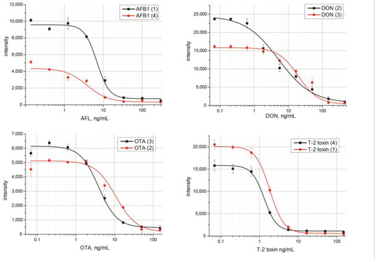 As can be seen from the Table 1, for reagents specific to APB1, DON, and T-2, the higher the kinetic association constant, the higher the equilibrium association constant. Only OTA-specific reagents deviate from this dependence: Ka is high due to a low kinetic dissociation constant. Thus, the equilibrium constant is more informative for making decisions about the design of a multiplex test system compared with the kinetic association constant.