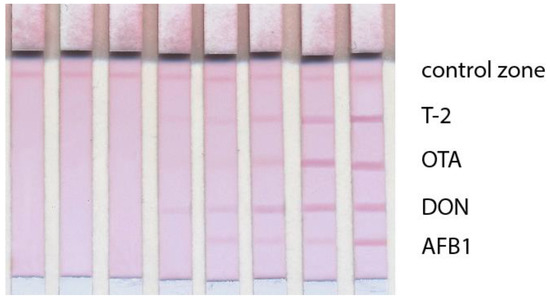 The applicability of the developed multiplex LFIA for the detection of mycotoxins in grain samples was tested. For this, corn extracts spiked with AFB1, DON, OTA, and T-2 were analyzed (Figure 7). It was demonstrated that the LODs (converted to g/g) remained the same as upon detection in the buffer and met practical requirements for mycotoxin determination.