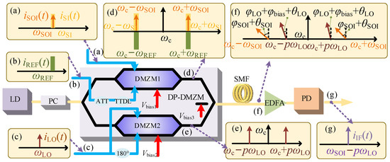 Assume that the optical carrier is Ec(t) = Ecexpjωct, where Ec and ωc represent the amplitude and angular frequency of the optical carrier, respectively. VLO, ωLO, and φLO represent the amplitude, angular frequency, and initial phase of the LO signal, respectively. The expressions of LO, SOI, SI, and REF signals are expressed as VLOsin(ωLOt + φLO), VSOIsin(ωSOIt + φSOI), VSIsin(ωSIt + φSI), and VREFsin(ωREFt + φREF). Vi, ωi, and φi represent the amplitude, angular frequency, and initial phase of LO, SOI, SI, and REF signals where i can be replaced by LO, SOI, SI, and REF. The optical modulated signals after DMZM1 and DMZM2 are expressed as follows, and the output spectra of sub-modulators are shown as insets (d) and (e) in Figure 1.