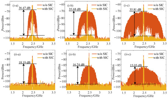 First, the SIC performance of the system was demonstrated. The LO signal was selected as a single-tone sinusoidal signal. The SOI signal was first set as a 16-quadrature amplitude modulation (QAM) modulated signal with a power of 10 dBm and a bandwidth of 50 MHz. The SI signal and REF signal were set as a 16-QAM modulated signal with a power of 20 dBm. The frequency of the SOI signal and SI signal were set to 12.5 GHz, and the corresponding LO signal frequency was 10 GHz. By beating with the +1st–order LO sideband and the +1st–order SOI (the interference signal at the same frequency) sideband in the PD, the down-conversion IF signal centered at 2.5 GHz was obtained. Simulation results of SIC performance with and without SIC are shown in Figure 2(i) when the bandwidth of the SI signal was set to 500 MHz, 1 GHz, and 2 GHz, successively. The output power of the LO signal was 13 dBm in this case. As can be seen from Figure 2(i), for SI signals with different bandwidths, satisfactory performance of SIC was achieved with a cancellation depth greater than 35 dB.