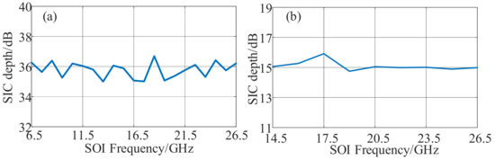 In order to demonstrate the HDC performance and the tunability of our scheme, we tuned the frequencies of the SOI/SI and LO signals to 20.5 GHz and 6 GHz. By beating the +3rd-order LO-modulated sideband and +1st-order SOI/SI signal sideband, the SIC and HDC were implemented successfully. The measured electrical spectra of IF signals with and without SIC when the bandwidth of the SI signal was set as 500 MHz, 1 GHz, and 2 GHz are shown in Figure 2(ii). The output power of the LO signal was increased to 27 dBm in order to obtain a high-power interference and down-converted IF signal. As can be seen, the SIC depth over 15 dB was successfully achieved with the SI signal suppressed under the noise. To study the self-interference cancellation performance under different received SOI frequencies, the carrier frequencies of the desired SOI signal and the self-interference signal were tuned from 6.5 to 26.5 GHz, and the frequency of the LO signal was correspondingly tuned from 4 to 24 GHz for fundamental down-conversion to ensure that the frequency of the IF signal remained at 2.5 GHz. The SI signal was a 16-QAM modulated signal with 2 GHz bandwidth, and other parameters were unchanged. Figure 3a shows the measured SIC depth curve of the received IF signal indicating that the SIC performance was satisfactory for different SOI frequencies with a SIC depth fluctuating around 36 dB. Then, the carrier frequencies of the desired SOI signal were tuned from 14.5 to 26.5 GHz, and the frequency of the LO signal was correspondingly tuned from 4 to 8 GHz for third-order harmonic frequency conversion. As shown in Figure 3b, the SIC depth fluctuated around 15 dB, showing that the SIC performance at different frequencies was basically the same.