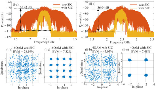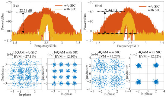 In order to investigate the recovery performance when HDC was performed, the frequencies of the SOI/SI and LO signals were switched to 20.5 GHz and 6 GHz. The LO signal power was increased to 30 dBm to obtain more intuitive and clear results. Other parameters were consistent with the previous analyses. As shown in Figure 5(i), when the SIC structure was used, the SIC cancellation depth reached 22.51 dB (Figure 5(i-a)), and the demodulated EVM was reduced from 27.11% (Figure 5(i-b)) to 12.10% (Figure 5(i-c)) which still complied with the 3GPP-specified EVM requirements for the 16-QAM signal below 12.5%. Then, the modulation format of SOI was changed to 4-QAM, and the self-interference cancellation and recovery results were obtained in the same way. Therefore, the wideband SIC depth was 21.44 dB, as shown in Figure 5(ii-a), and the 4-QAM SOI was recovered with an EVM value of 12.32%, as demonstrated in Figure 5(ii-c).