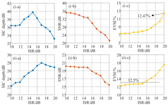 The cancellation and recovery performance of SOI with different interference-to-signal ratios (ISRs) was also investigated, corresponding to the previous analyses of 16-QAM modulation with fundamental down-conversion and harmonic down-conversion. The power of the SOI signal remained unchanged at 10 dBm, while the power of the SI signal switched with a step of 1 dBm from 20 dBm to 30 dBm, corresponding to the ISR change from 10 dB to 20 dB. The other parameters were unchanged. Figure 6 shows the measurement curves of the SIC depth, the signal-to-noise ratio (SNR), and EVM. As can be seen in Figure 6(i), for the fundamental down-conversion, with the increase in ISR, the SIC depth (Figure 6(i-a)) first increased and then decreased, while the SNR (Figure 6(i-b)) generally deteriorated. The changing trend of SIC depth is due to the power of the interference signal being increased initially, and the SI signal was basically canceled under the noise, which leads to an increase in SIC depth. While with the continuous increase in SI signal power, the cancellation performance deteriorated, resulting in a decline in SIC depth. As for SNR, with the increase in the SI signal power, the value of J0(βSI) was reduced, so the power of the IF signal dropped slowly. As the power of the SI signal continued to increase when the ISR exceeded 15 dB, the SIC performance deteriorated, leading to a sharp decline in the SNR. Fortunately, a demodulated EVM (Figure 6(i-c)) satisfying the 3GPP-specified EVM limit for the 16 QAM signal could be achieved when the ISR was below 20 dB. As for harmonic down-conversion, the principle of SIC depth (Figure 6(ii-a)), SNR (Figure 6(ii-b)), and EVM (Figure 6(ii-c)) change trends are consistent with the analysis of fundamental down-conversion. A satisfactory EVM below 12.5% can be achieved when the ISR does not exceed 15 dB.