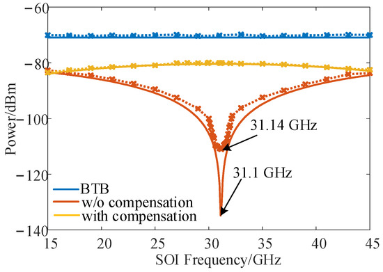 Measured IF power as a function of the SOI frequency in the theoretical analysis (solid line) and in the simulation (dashed line).