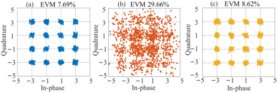 For an RoF link, the ability to overcome the dispersion-induced power-fading effect is important for the improvement in SOI recovery, so the DIPF compensation performance for long-distance fiber transmission was demonstrated. The fiber length was set as 25 km in the simulated long-distance optical fiber transmission scenario. Taking fundamental down-conversion as an example, the theoretical curve of the IF signal power versus the SOI frequency was drawn for the conventional DSB-modulated frequency down-conversion link without DIPF compensation. The frequency of the SOI and SI signals was tuned from 15 GHz to 45 GHz, and the LO signal was tuned from 12.5 GHz to 42.5 GHz with a fixed IF signal centered at 2.5 GHz. In Figure 7, the solid orange line shows a power fading point near 31.1 GHz. According to Equation (8), a proper DC bias of the main modulator was calculated for power compensation in this case, and as the solid yellow line in Figure 7 shows, the fading point in the solid orange line switched to peak points in the solid yellow line. As a reference, the curve without transmission over fiber (back to back, BTB) was plotted in a solid blue line when the main DC-bias-induced phase shift was zero. Next, based on the simulation setup, a 16-QAM SOI with 500 MHz bandwidth and a 2 GHz SI signal were used in the following simulation. The output power of SOI and SI signals remained at 10 dBm and 20 dBm. The LO signal power was 13 dBm. The detected IF power as a function of the SOI frequency is also plotted in Figure 7 for the case when the SIC is enabled. The fading point is at 31.14 GHz, which basically agrees with the theoretical results, as shown by the dashed orange line. In addition, the simulation results were consistent with the theoretical analysis, showing good performance for DIPF compensation, as shown by the dashed yellow line. The demodulated constellation diagram of the IF signal when the SOI signal is centered at 31.1 GHz with SIC enabled is also shown in Figure 8. Without fiber transmission, the demodulated constellation diagram is clear, with a measured EVM of 7.69%. After 25 km of fiber transmission and without compensation, the SOI frequency was at the power fading point, and the EVM deteriorated from 7.69% to 29.66%, which made effective communication completely impossible. Fortunately, after adjusting the DC bias of the main modulator for DIPF compensation, the IF power was compensated well, and the EVM recovered to 8.62%.