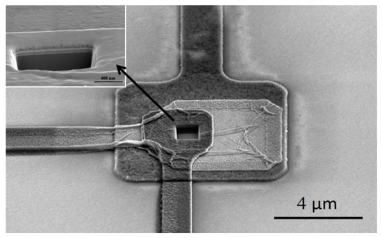 In order to achieve practical applications and truly become the next generation of electronic devices, nanoscale vacuum triodes need to be integrated into the circuit to operate. Therefore, advanced semiconductor manufacturing technology was adopted to realize the batch manufacturing of nanoscale vacuum triodes on the wafer. The whole process was completed on a 3 inch n-Si (100) substrate, with 0.8 µm SiO2 being formed on the wafer by thermal oxidation technology to isolate the device from the substrate. The semiconductor-free devices are unaffected by the substrate during operation. An amount of 15 nm Mo was deposited on the substrate by electron beam evaporation and patterned by ultraviolet lithography as a cathode, after which 20 nm Al2O3 and 15 nm Mo were deposited successively, and Mo was patterned as a gate. The second step was repeated to obtain an anode. Finally, a 1 × 1 × 1 μm3 square well was etched in the middle of the overlapping electrode from the top anode to the Si substrate by focused ion beam etching (Figure 2), which was the vertical vacuum channel. The emission area was determined by the perimeter. The length of the channel was 1 µm, while the transmission distance of electrons emitted from cathode edge to anode was 55 nm (less than 60 nm), which was determined precisely by the thicknesses of insulating layers and gate (Figure 1). Figure 2 shows the active part of the device. The sizes of cathode, gate, and anode from bottom to top are 8 µm, 6 µm and 4 µm, respectively. The illustration in the upper left corner shows the multilayer film structure with clear interfaces.