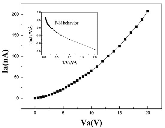 where a and b are constant. The curve exhibits obvious F–N behavior in the high electric field (low 1/Va), which proves that electrons are emitted from the cathode through FN tunneling. In the low electric field (high 1/Va), the slope of the curve changes. That may result from other mechanisms, e.g., the space-charge-limited current mechanism [].