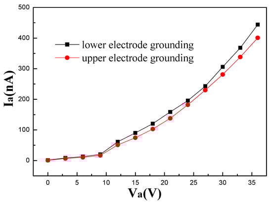 The cross section of the well exhibits that the upper electrode and the lower electrode are symmetrical, and they have identical materials and effective working surfaces. If the lower electrode is grounded, the upper electrode is used as the anode. On the contrary, if the upper electrode is grounded, the lower electrode is used as the anode. The reverse voltages were applied to the electrodes for measurement (Figure 4). Since the upper electrode was close to the opening of the well, it could only collect a fraction of electrons emitted from the cathode when it was used as the anode (red line). While the lower electrode was in a closed space formed by Si/SiO2, it could collect more electrons (black line). When the applied voltage was 15 V, Iblack is 21% higher than Ired.