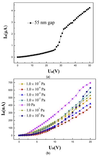 (a) Current–voltage plot of the device with a transmission distance of 55 nm. (b) Field emission characteristics under different vacuum degrees.