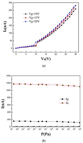 (a) Anode current versus anode voltage characteristics of a triode at Vg = 10 V, 15 V, or 25 V. (b) Emission stability with different pressures at Vg = 8 V and Va = 10 V.