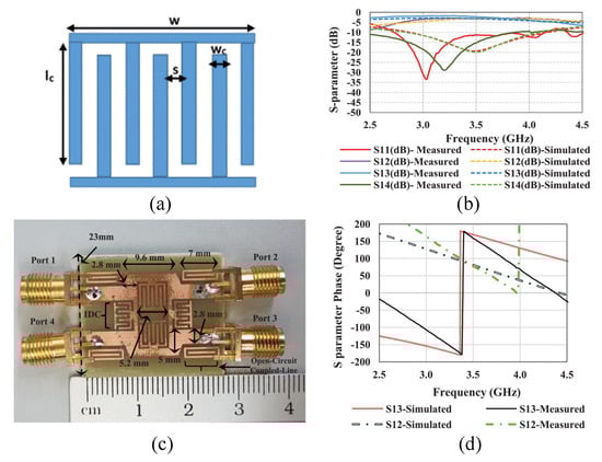 Schematics of the antenna in [] with metamaterial to improve bandwidth. (a) Metamaterial structure, (b) S-parameters of the antenna, (c) fabricated prototype, (d) S-parameter phase. Reprinted from Ref. [].