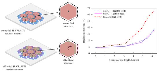 The efficiency improvement metamaterial antenna proposed in [] consists of center-fed and offset-fed antenna for right- and left-handed transmission linea. In this work, the radiation efficiency is enhanced up to 27.6% in zero-order resonant mode and 56.8% in TM010 mode because of slots etched on the ground plane, as depicted in Figure 7. In [,,], microstrip patch antennas are integrated with metamaterials which enhance the performance of the antennas in terms of their radiation efficiency. The presented designs have split ring resonators affiliated with the radiator or geometrically attached to the metasurface to improve the radiation characteristics.