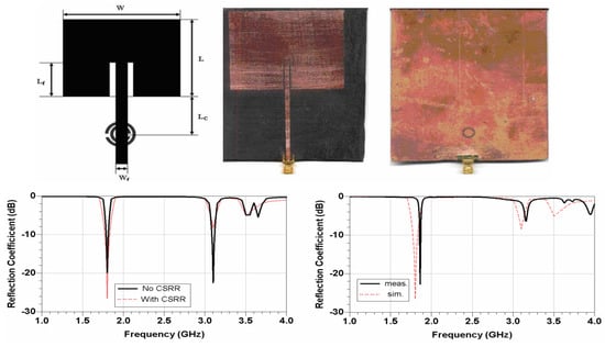 Microstrip patch antennas utilize geometric variation in the parent patch and integrate the split ring resonators in the ground plane which generally improve the dimensions of the antenna [], as given in Figure 8. It can be observed that no net effect on the simulated and measured S-parameter is observed by loading CSRR, whereas size is reduced in order to obtain a compact antenna. In [], the comparison of antenna characteristics in terms of physical size, reflection co-efficient, bandwidth, gain, and radiation patten is performed, which shows that by loading metamaterial onto antenna, the size of the antenna is reduced by 28% and up to 70% in the case of the half- and full-ground plane, respectively. A metamaterial-loaded antenna for size reduction applications is given in [], which shows that after loading the metamaterial, the antenna’s size was reduced by 82.77% with 38.23% improvement in return loss. Moreover, in [] an antenna designed on a high-permittivity dielectric superstrate is given, where a periodic structure of patches acting as an AMC is used for size reduction of the antenna.