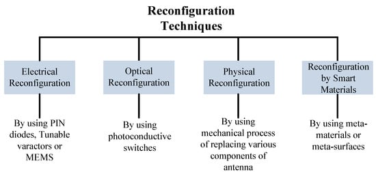 Modern wireless communication systems require antennas to operate in multiple modes used for different wireless services. These multiple mode operating antennas need fast and efficient systems to provide shifting among various modes, which can be true in reconfigurable antennas []. The reconfiguration of antennas relates to the capacity to adjust radiator performance in terms of operating frequency, radiation pattern, or polarization []. A number of techniques are adopted to obtain the requirements discussed above by researchers and academia. Reconfigurations are achieved by using p-i-n diodes, MEMS, tunable varactors, optical devices, or mechanical techniques as given in Figure 11 []. In this section, the reconfiguration of antennas by using metamaterials will be discussed in term of frequency, pattern, and beam steering.