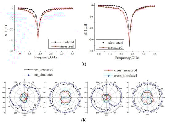 (a) Comparison among simulated and measured S-parameters; (b) radiation pattern for resonating frequencies. Reprinted from Ref. [].