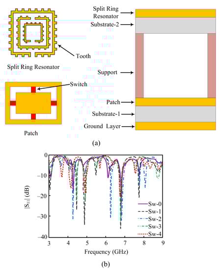 The SRR loaded reconfigurable antenna (a) geometrical configuration (b) |S11| results (adapted from []).
