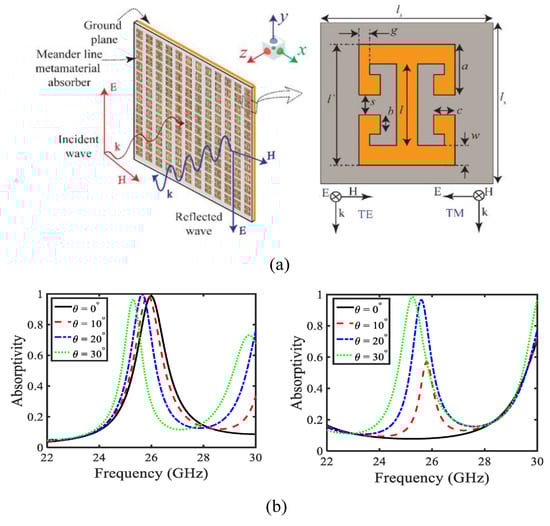 - Naqvi, S.A.; Baqir, M.A.; Gourley, G.; Iftikhar, A.; Khan, M.S.; Anagnostou, D.E. A Novel Meander Line Metamaterial Absorber Operating at 24 GHz and 28 GHz for the 5G Applications. Sensors 2022, 22, 3764. [Google Scholar] [CrossRef] [PubMed]