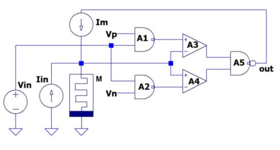 The comparator converts the voltage v on the memristor to a binary output signal Vout. The current generator Im, which is included in the negative feedback network of the comparator, converts the binary output signal (“0” and “1”) into negative current and positive current through the memristor (−I, +I), respectively.