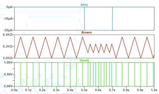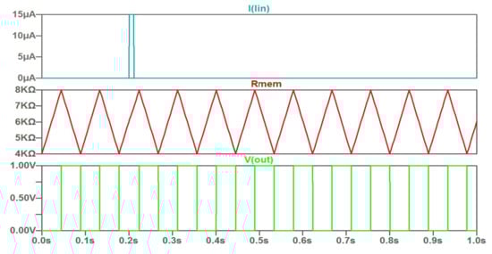 As a feature of the current control type, we can mark that a narrow input current pulse does not have a significant effect on the time diagram. This is shown in Figure 3. A distinctive feature of the potential control (threshold control) is shown in Figure 4. The modulation by the input signal happens at a constant rate of change of the memristor resistance. In this case, the range of variation of the memristor resistance is varied. Accordingly, the duty cycle of the output signals changes.